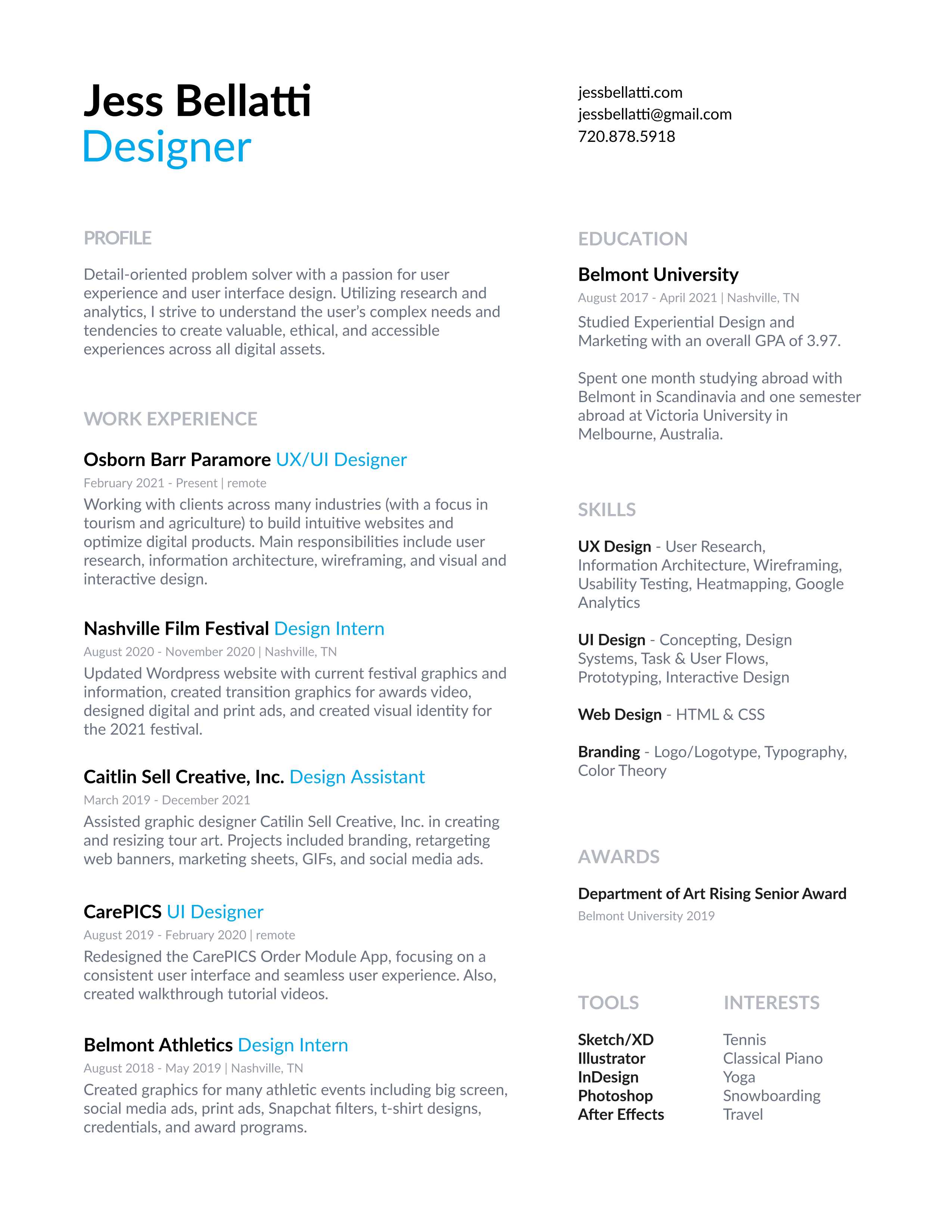 Hi, I'm Jess! Although I can wear many graphic design hats, I specialize in user experience and user interface design. I'm originally from Colorado, but currently live in Nashville, TN where I'm working remotely as a UX Designer for OBP Agency. In 2021, I graduated from Belmont University where I studied Experiential Design and Marketing. In my work, I value attention to detail and understanding the complex needs of the target audience/end user to create the most effective solutions. While my passion lies in solving creative challenges, I also love tennis, yoga, classical piano, and travel.
